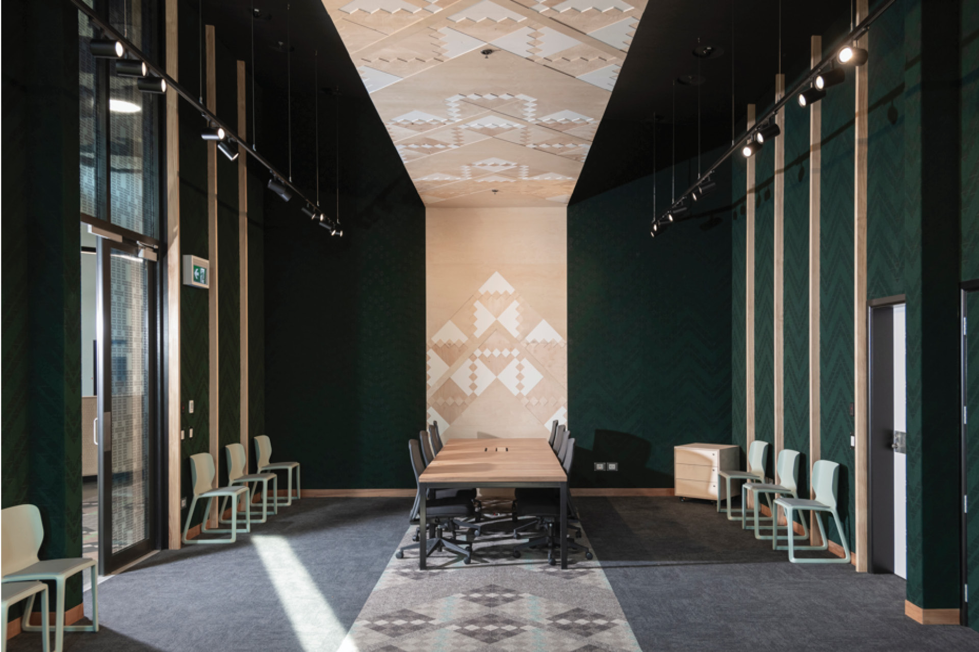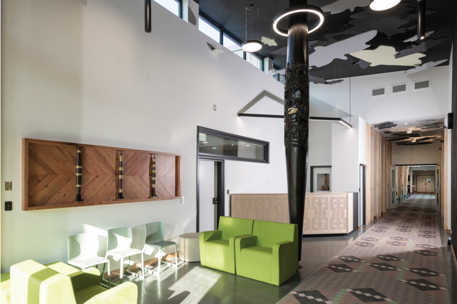 Custom designed whariki and tukutuku patters which are integrated into floor wall and ceiling designs