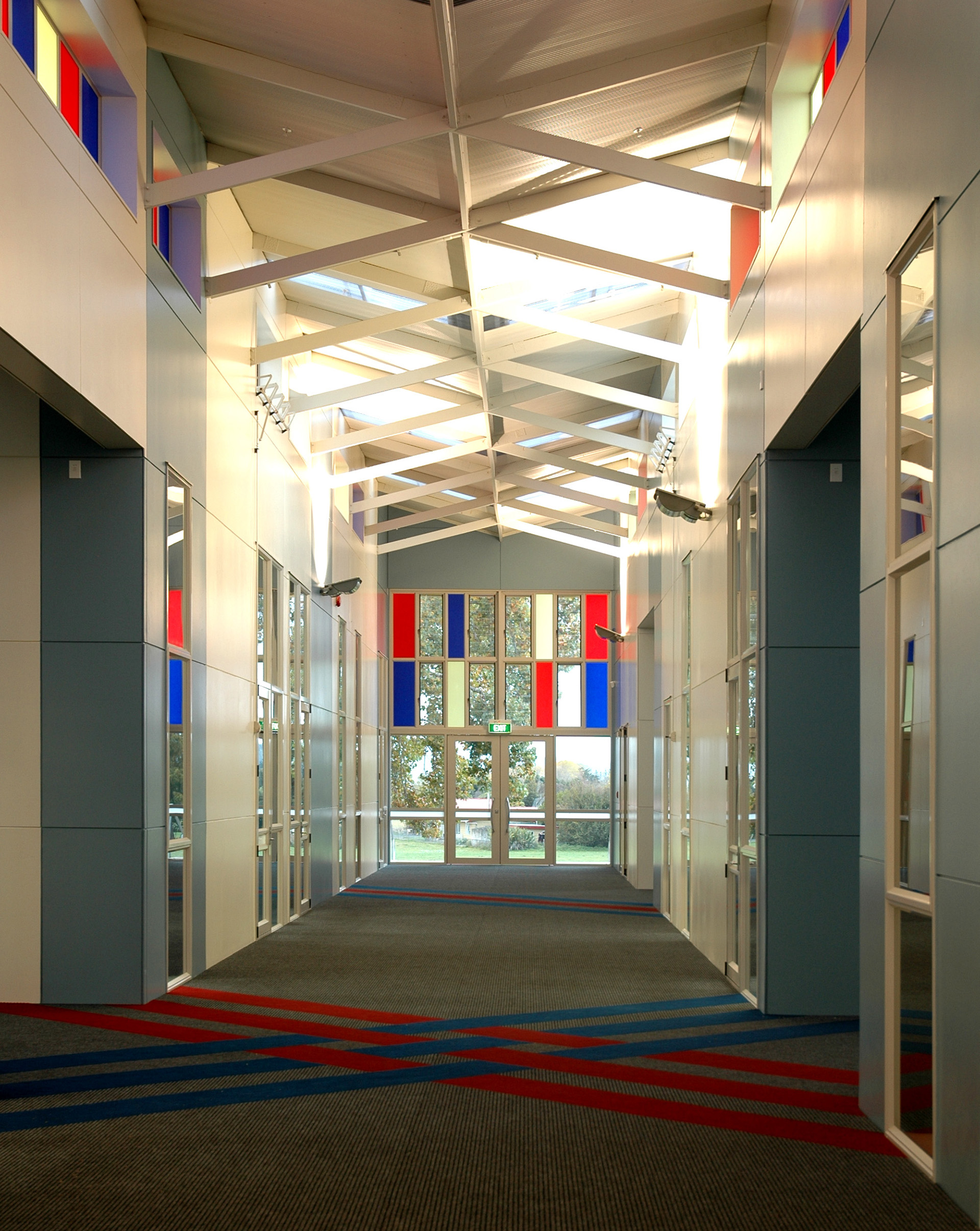 The building references the outline of Mt Hikurangi with the sloping ridges leading to the twin peaks. The central corridor reflects the language of the marae with a central tuhuhu (ridge beam), and was designed to evoke a waka, representing the learning journey that the students take during their time at the school. Exposed rafters and coloured clerestory glazing contribute to the generous sense of space. Flexible planning allows a variety of uses, creating a focal point for the community.