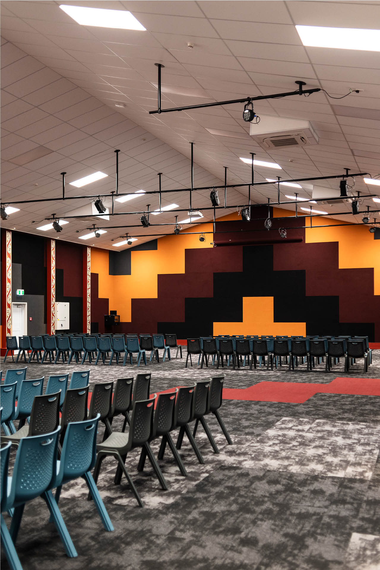 This plainness provides a dramatic contrast to the interior. The entrance foyer has had the ceiling raised and has dark moody black walls, representing the night. The doorways into the hall frame a new black trophy cabinet with discrete LED lighting and together with the new honours boards provide an inspirational entrance for students and community. The hall has had the stage removed to create a much larger flexible space. The walls have been lined with Autex Composition in patterns designed by artist Simon Lardelli telling the story of the morning light rising in the east over rippling waters that are represented in the carpet tiles.