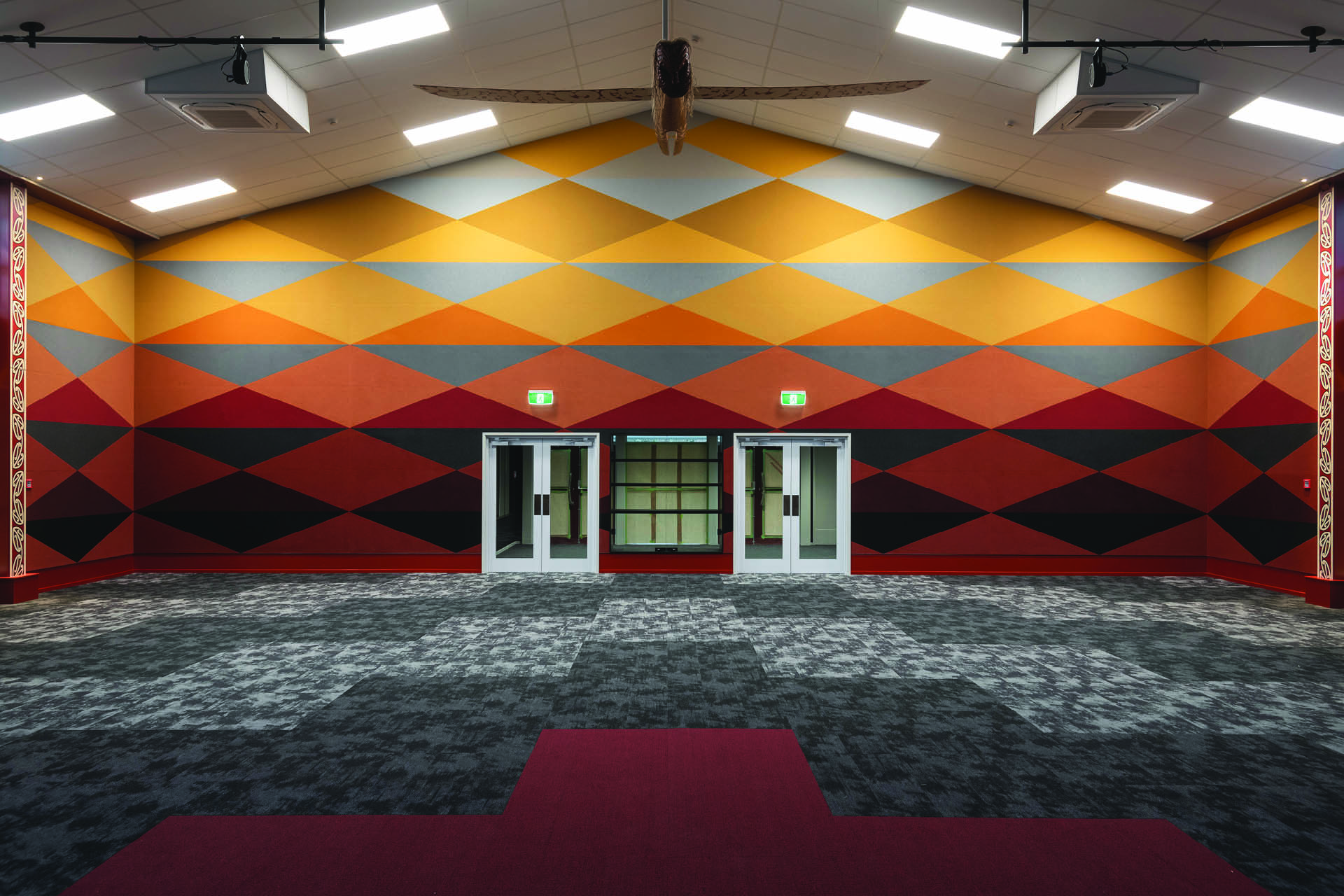 The western end (former stage end) of the hall signifies the setting sun and striving for higher things through the use of the Poutama pattern. Linking the eastern and western ends of the hall is a striking black and yellow pattern on the walls. The carpet is Inter Tile from Jacobsen Flooring and the wall patterns have been carefully set out to align with the carpet and connect these walls together. Simon has also designed new window decals for the upper windows to continue the story telling.
