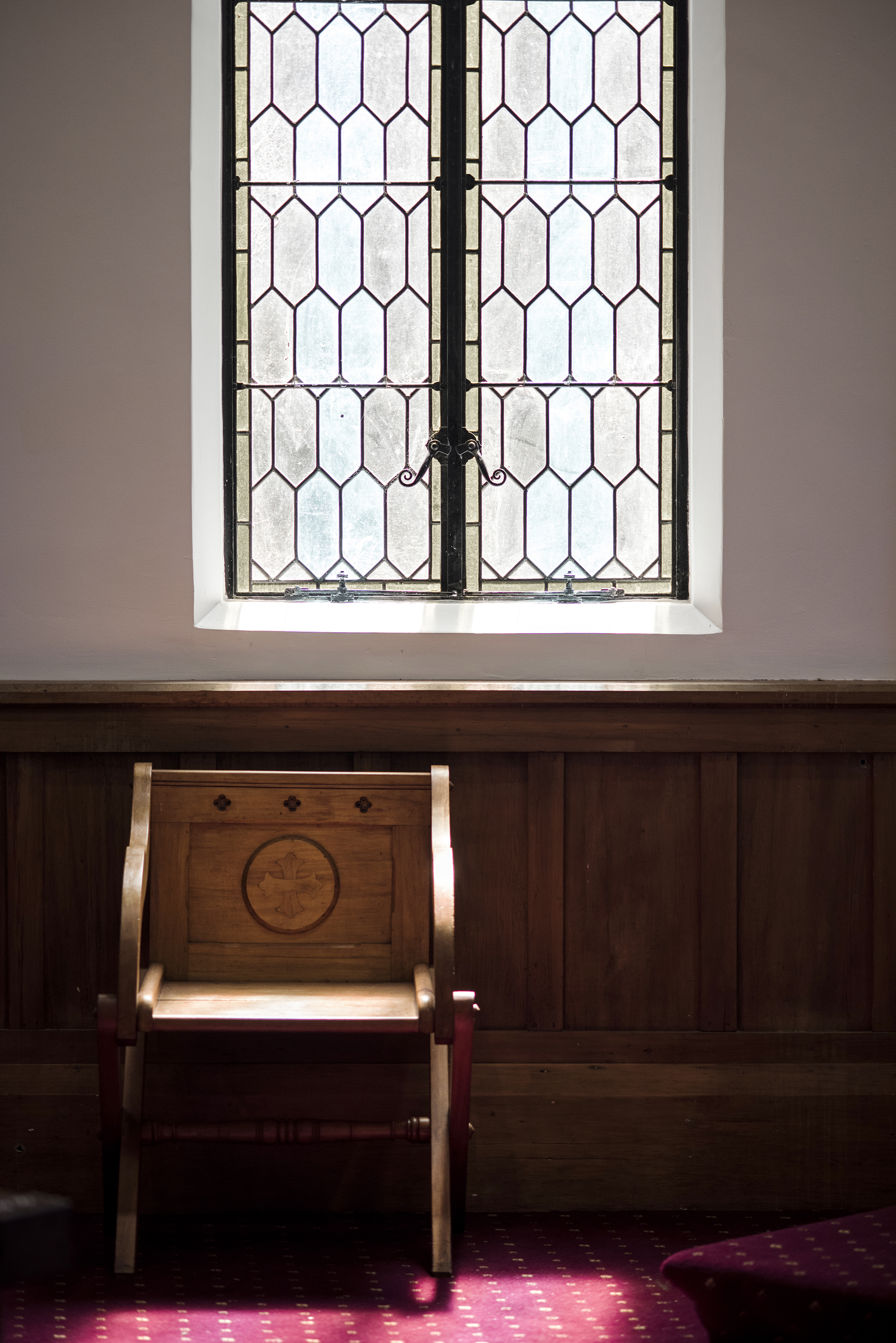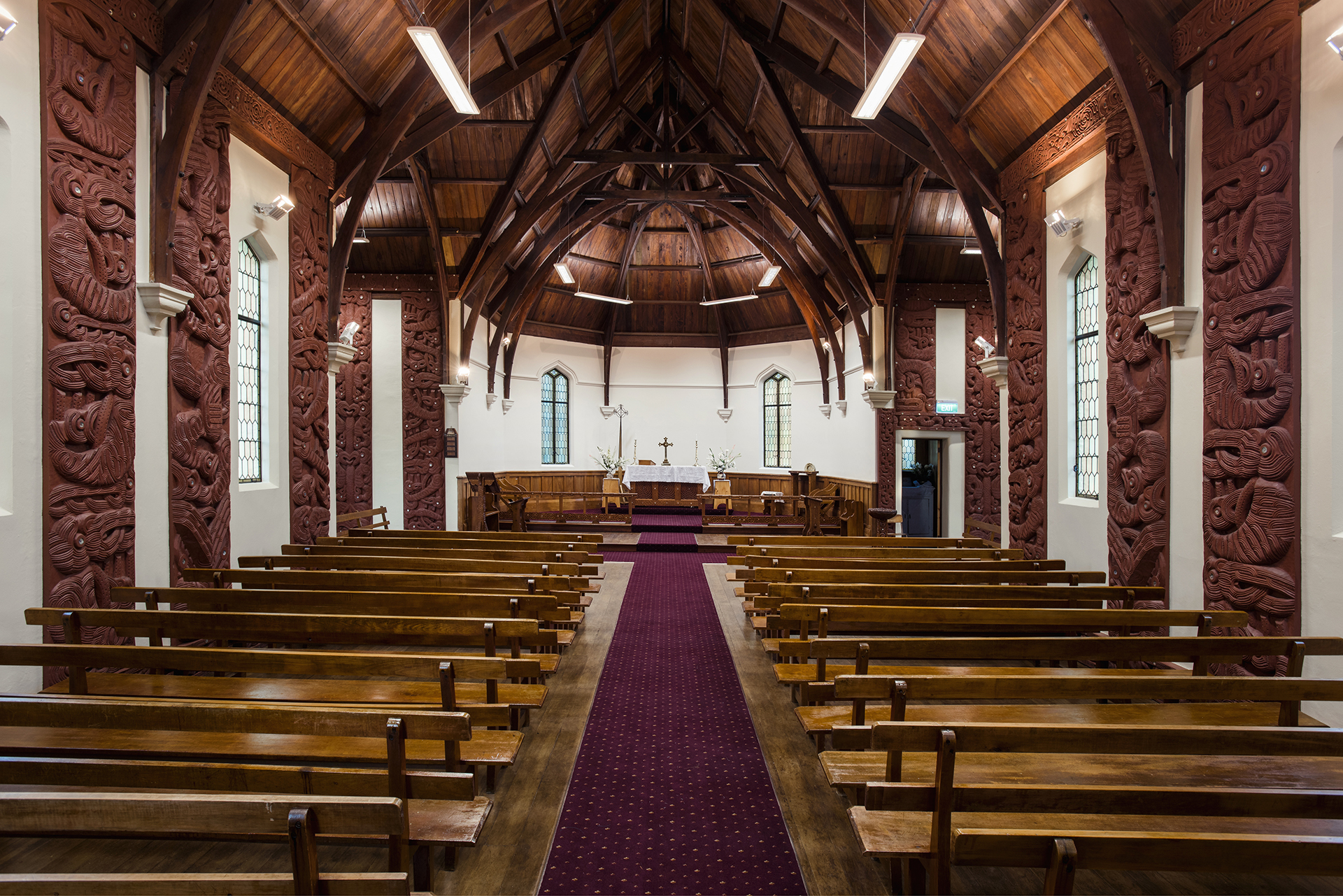 … this discreet structural upgrade retains the integrity of the original building. Carbon-fibre, inserted behind exceptional whakairo (carved wooden panels) helps bring the church up to code.